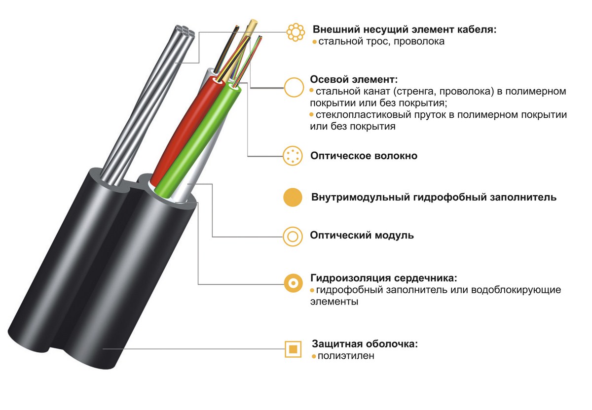 КТ...-...Д Подвесной оптический кабель типа "8" с внешним металлическим несущим элементом на основе модульной конструкции