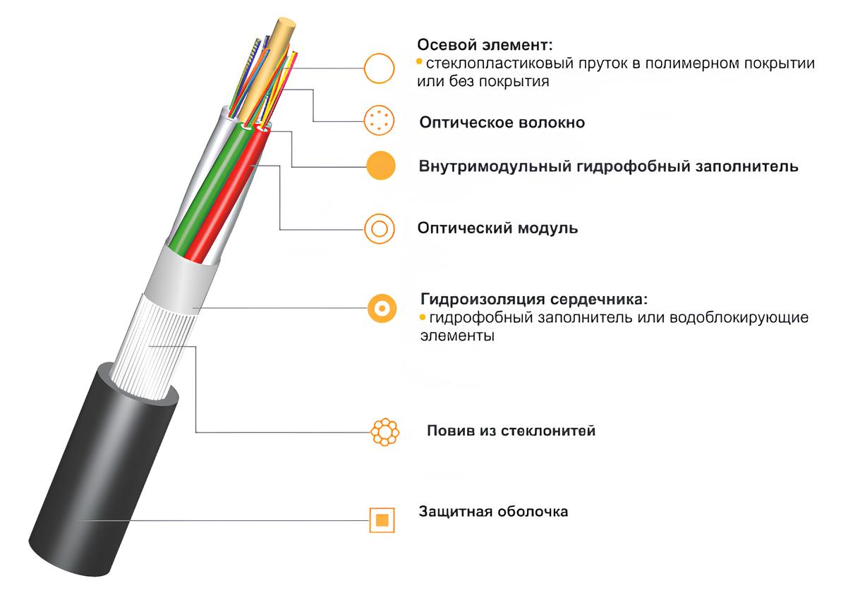 Конструкция основана на повиве оптических модулей вокруг центрального силового элемента, что позволяет разместить до 288 волокон. Слой упрочняющих стеклонитей обеспечивает необходимую стойкость к растяжению, сохраняя при этом гибкость и малый вес кабеля. Модульная структура надежно защищает волокно от механических нагрузок, а широкий температурный диапазон (от -60°C до +70°C) гарантирует стабильную работу в любых климатических зонах.