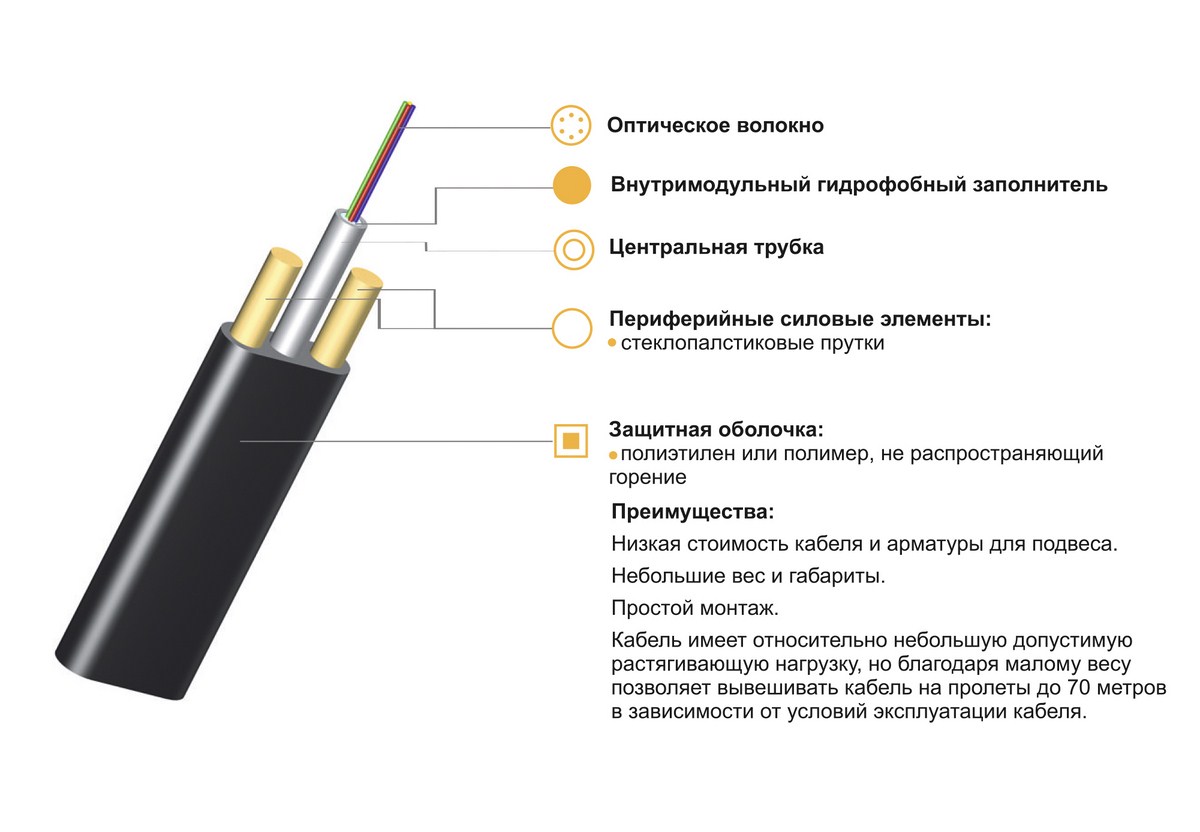 Оптический кабель ОКТ2С-Т — это компактный самонесущий кабель плоского типа, специально разработанный для подвеса на опорах линий связи, освещения, а также для междомовых соединений. Конструкция состоит из центральной трубки с волокнами, по бокам которой в одной плоскости расположены два диэлектрических силовых элемента (стеклопластиковые прутки).