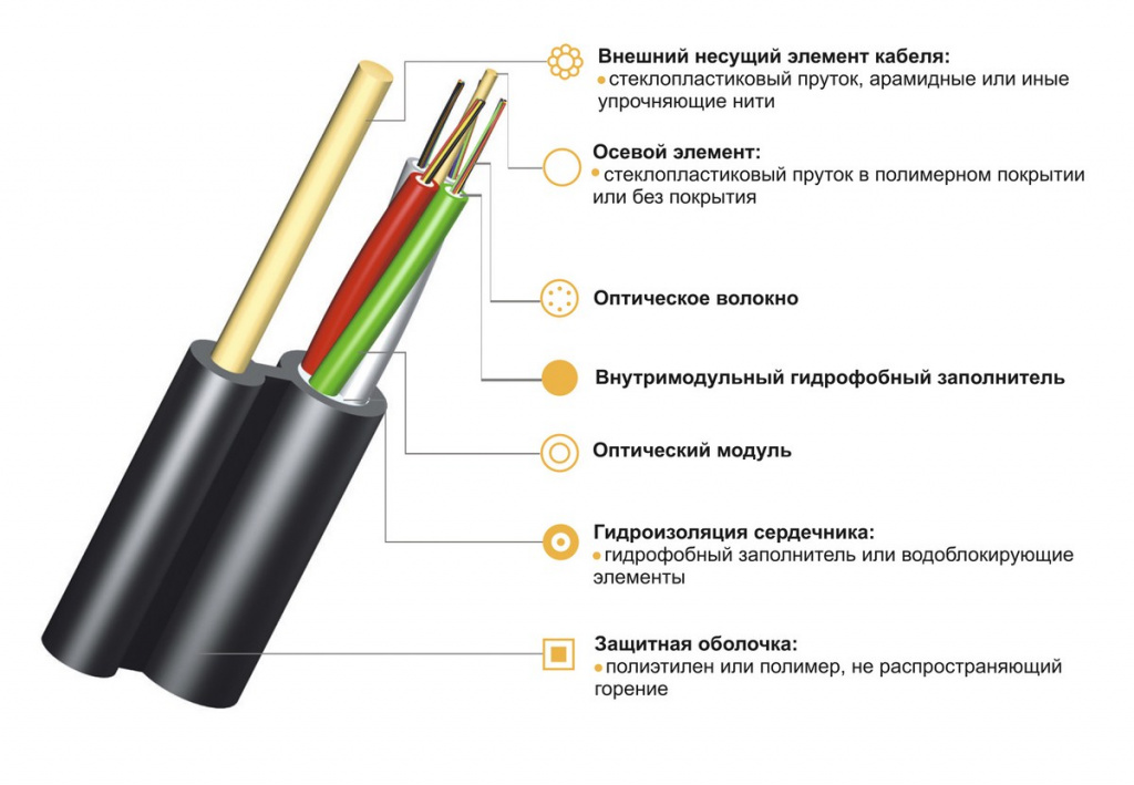 Оптический кабель ОКТС-Д — это мощное решение для организации подвесных магистральных линий связи с высокой плотностью волокон. Конструкция выполнена в формате «фигуры 8», где сердечник кабеля (модульная скрутка) и внешний силовой элемент (диэлектрический стеклопластиковый пруток) объединены общей полиэтиленовой оболочкой.